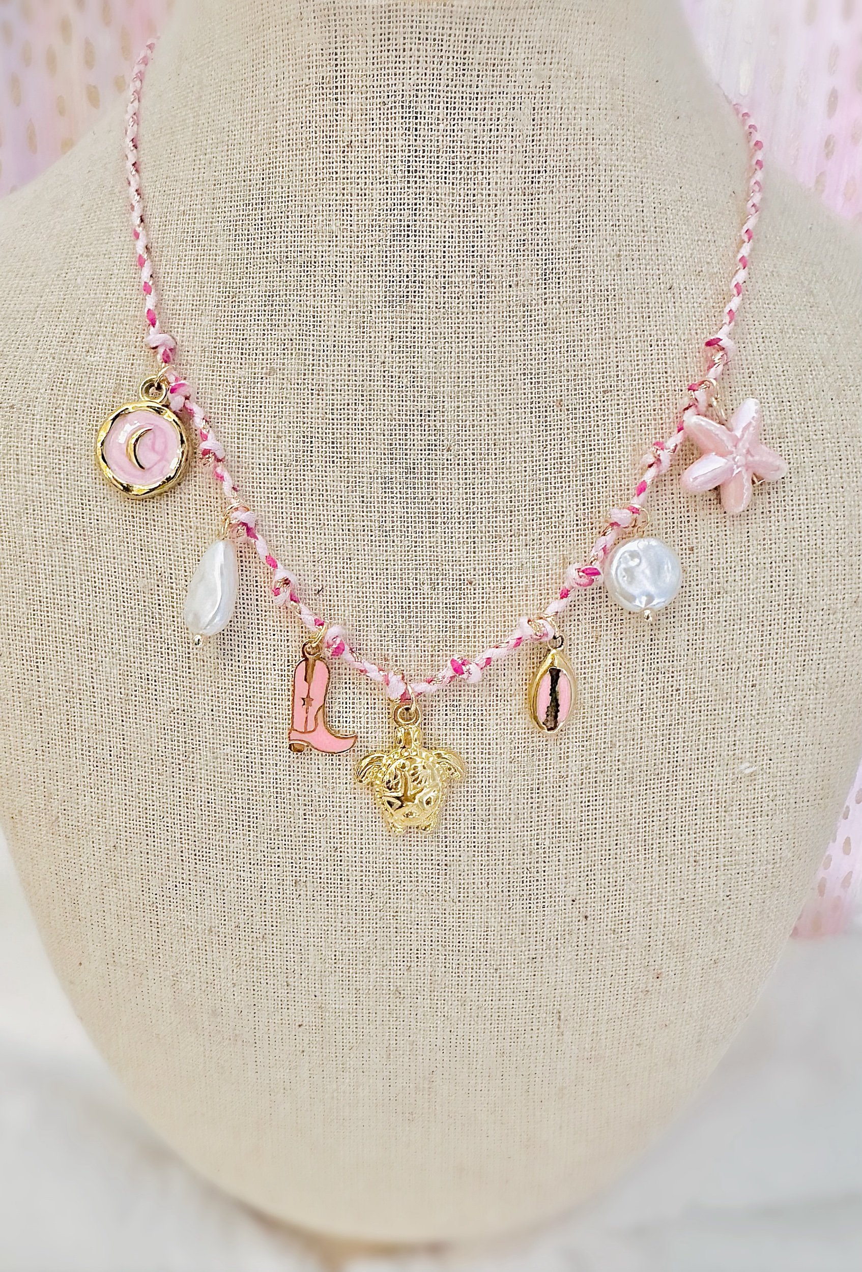 Bring all the summer fun into one necklace! This Coastal Cowgirl Charm Necklace features a playful mix of beach and western-inspired charms — including a pink starfish, a pearl drop, a cowrie shell, a cowboy boot, and a gold-plated cowgirl hat charm. Each one is carefully placed along a pink braided cord, adding a bright pop of color and personality to any outfit.